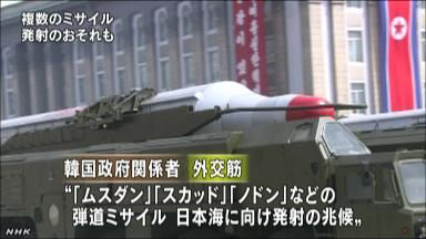 韓国国防省は、北朝鮮が「ムスダン」とみられるミサイルを発射するとすれば、10日の可能性が高いと見ていて、新たに確認された動向によって、北朝鮮が複数の弾道ミサイルを同時、あるいは連続して発射するおそれも出てきたと分析しています