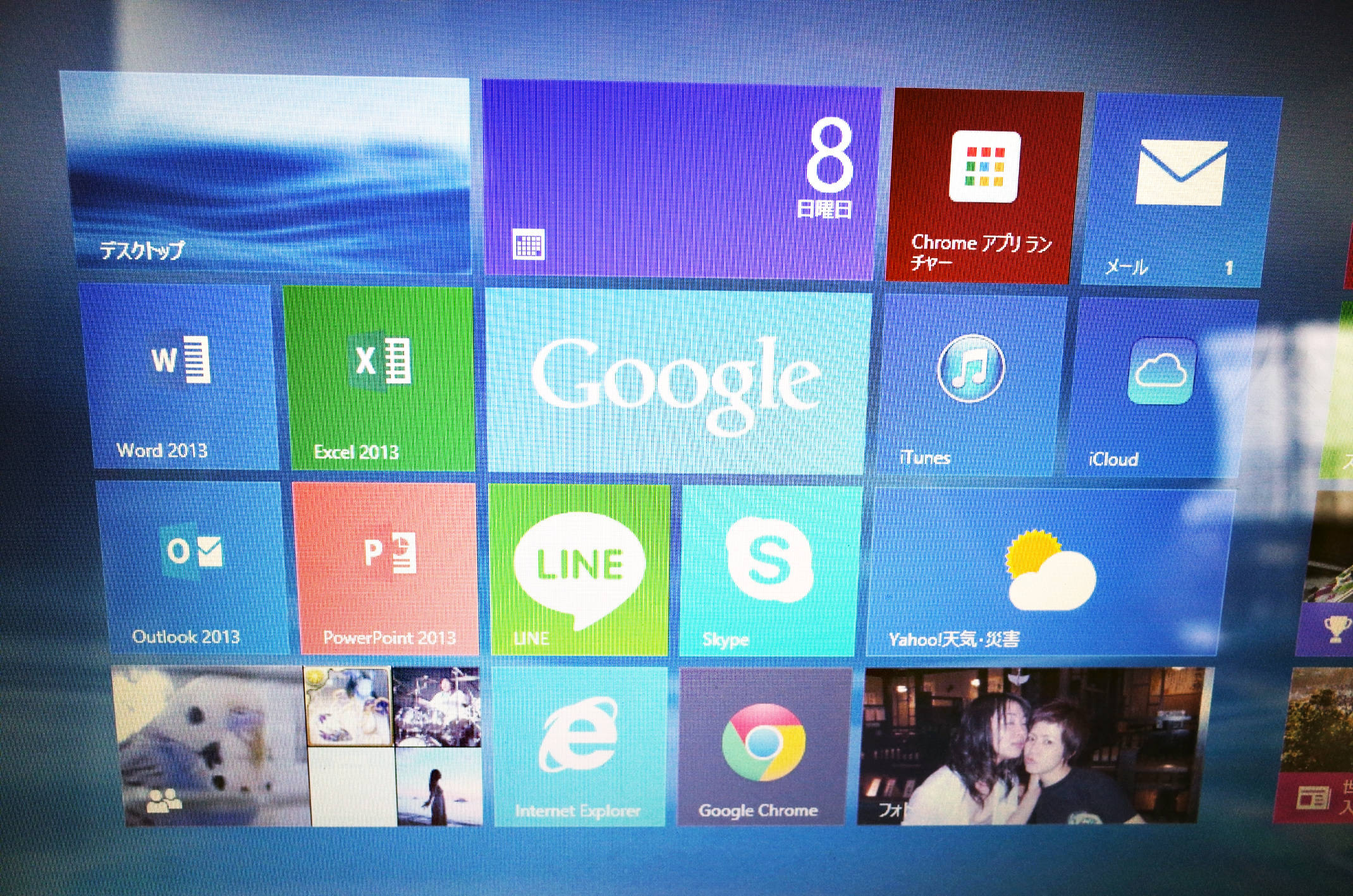 そんなこんなでカスタマイズしていくうちに、スタート画面も下の写真のようにMicrosoft臭のない、すっかりニュートラルな画面にいつの間にか変わっていました。僕はMicrosoft社のアプリはIEとOfficeだけあれば十分だと思っているので、それ以外はほとんど消しちゃいました。スッキリしました。