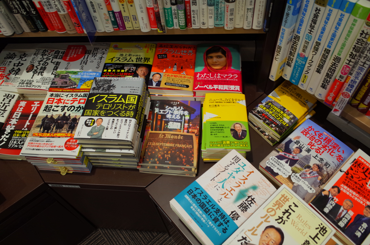 しかし周囲のイカツイ本に囲まれて、いかにも名前がふざけた感じがするし、本自体がまるで萎縮しちゃったみたいです。上下を挟んでいる本は「わたしはマララ・ノーベル平和賞受賞」と佐藤優さんの「イスラエルとユダヤ人に関するノート」他にも「イスラム国」とか「テロ」とかの文言がならんでいます。池上さんの写真もあのマララさんの目力には勝てません。そうです、ここは「国際・政治」のコーナーなのです。僕の本のような初心者向けの本が紛れ込んじゃあいけない、もっと深〜い議論をする本の溜まり場なのです。有隣堂さ〜ん、ちょっと考えていただけませんかあ?!(有隣堂さんは時々キラリと光る絶妙なアレンジメントを見せるので、昔から好きだったんだけどな。もしかしたら有隣堂さんには深い秘策があるのかもしれません。)