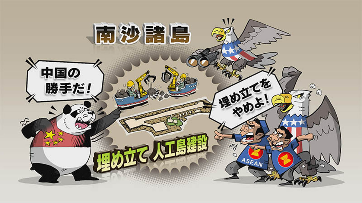 中国との領土問題というと、私たちは尖閣諸島への干渉をまず思い浮かべます。けれども中国のアジア太平洋地域への侵略行為はそれだけではありません。むしろ南シナ海の南沙諸島(英語名、スプラトリー諸島)でのベトナム、マレーシア、フィリピン領海に隣接する海域で、島ではない岩礁を人工的に埋め立てて、無理やり島を作り、そこに軍事基地を作っている行為のほうが、はるかにビックリです。スキューバ・ダイビングが好きな僕としては、あのあたりのサンゴ礁は最高に美しい海域だけに、無粋な軍事施設を作られるのは嫌だなあ、という気持ちがありました。(辺野古新基地についても同じ気持ちがありますが)。